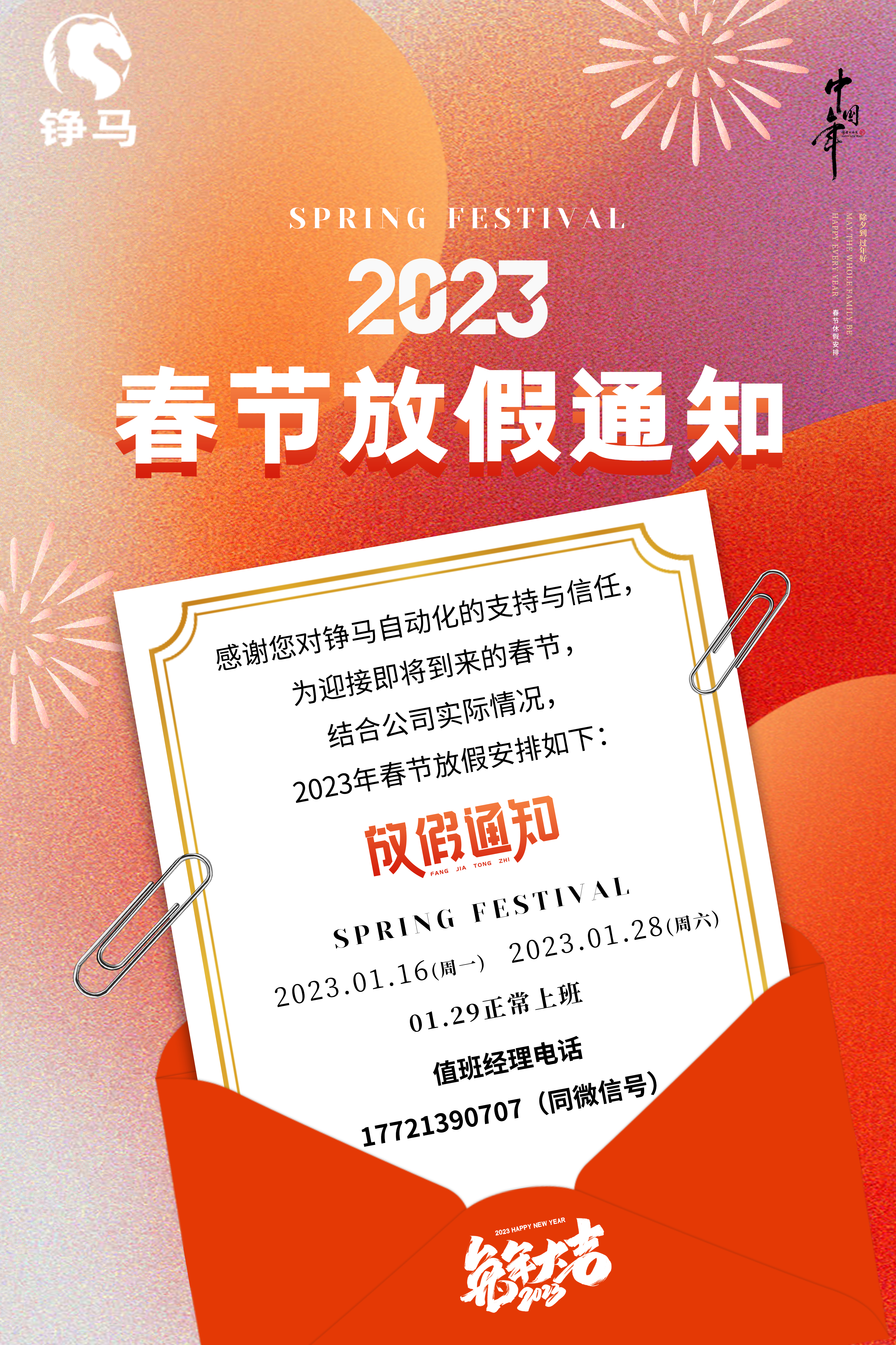 2023-01感謝您在過(guò)去的一年里對(duì)我們的關(guān)注、信任與支持。飲水思源,在新的一年,錚馬自動(dòng)化將秉持初心,繼續(xù)以?xún)?yōu)質(zhì)高效的服務(wù)為您提供更加全面的服務(wù)!值此新春佳節(jié),錚馬自動(dòng)化在此瑾向各位致以誠(chéng)摯的祝福和問(wèn)候:愿所念之人,平安喜樂(lè);愿所想之事,順心如意!根…